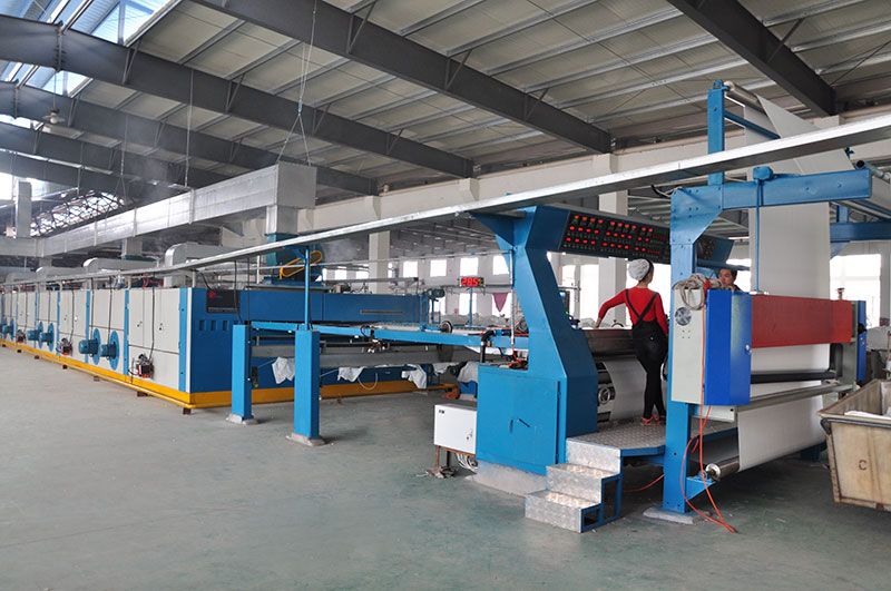 | 工藝流程:平幅進(jìn)布 → 緊布架 → 上漿 → 軋干 → 上針 →拉幅烘干 → 刷絨 → 脫針 → 落布 |
